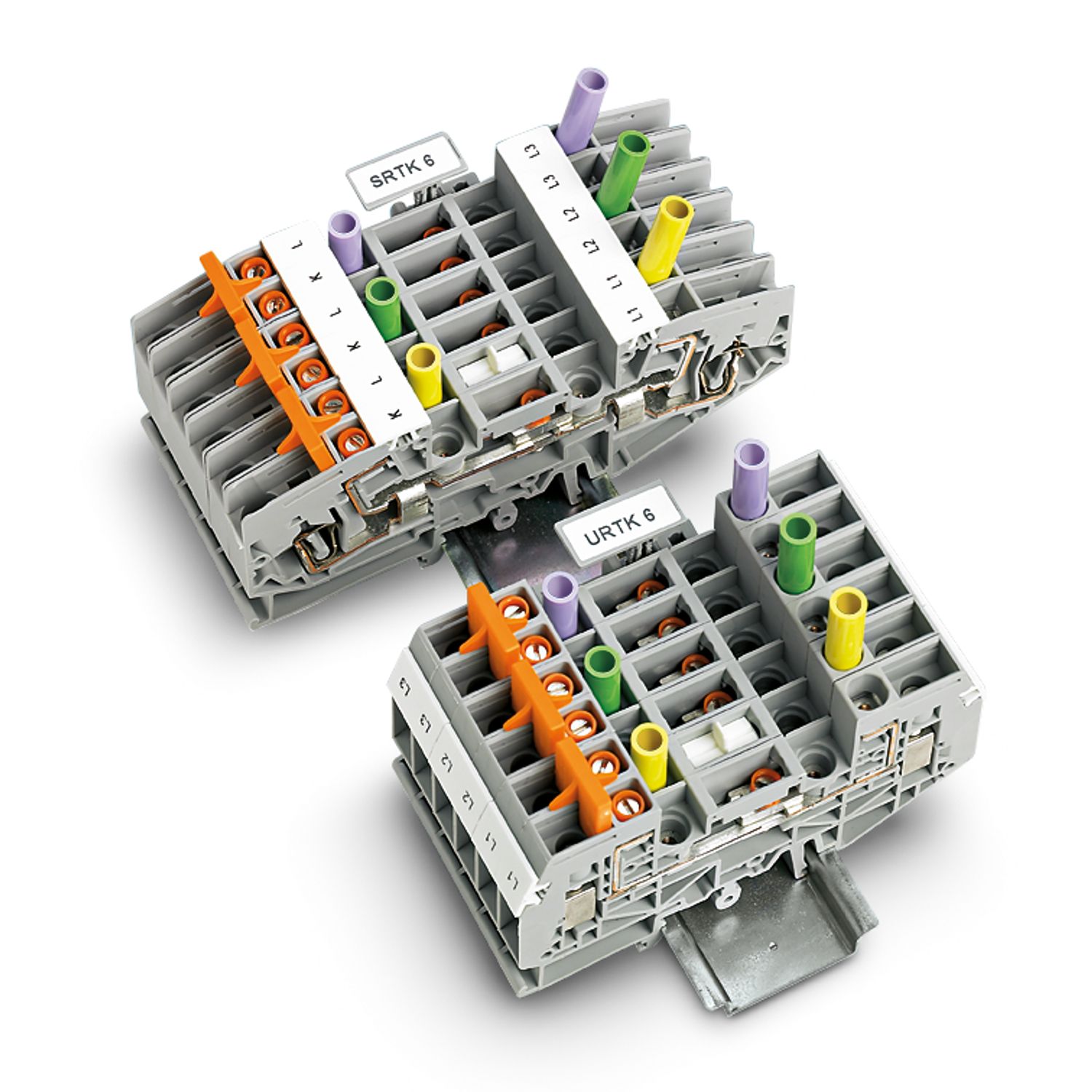 Контрольные гнезда с защитой от прикосновений и диаметром 4 мм предустановлены|Клеммы могут оснащаться жесткими и коммутируемыми перемычками с обеих сторон