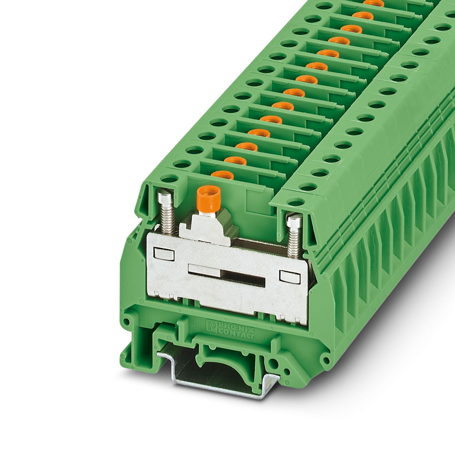 Ползунковая клемма, со скользящей перемычкой, номинальное напряжение: 500 В, номинальный ток: 41 A, количество точек подсоединения: 2, тип подключения: Винтовые зажимы, Расчетное сечение: 6 мм2, 1. ярус, cечение: 0,5 мм2 - 10 мм2, тип монтажа: NS 35/7,5, NS 35/15, NS 32, цвет: зеленый