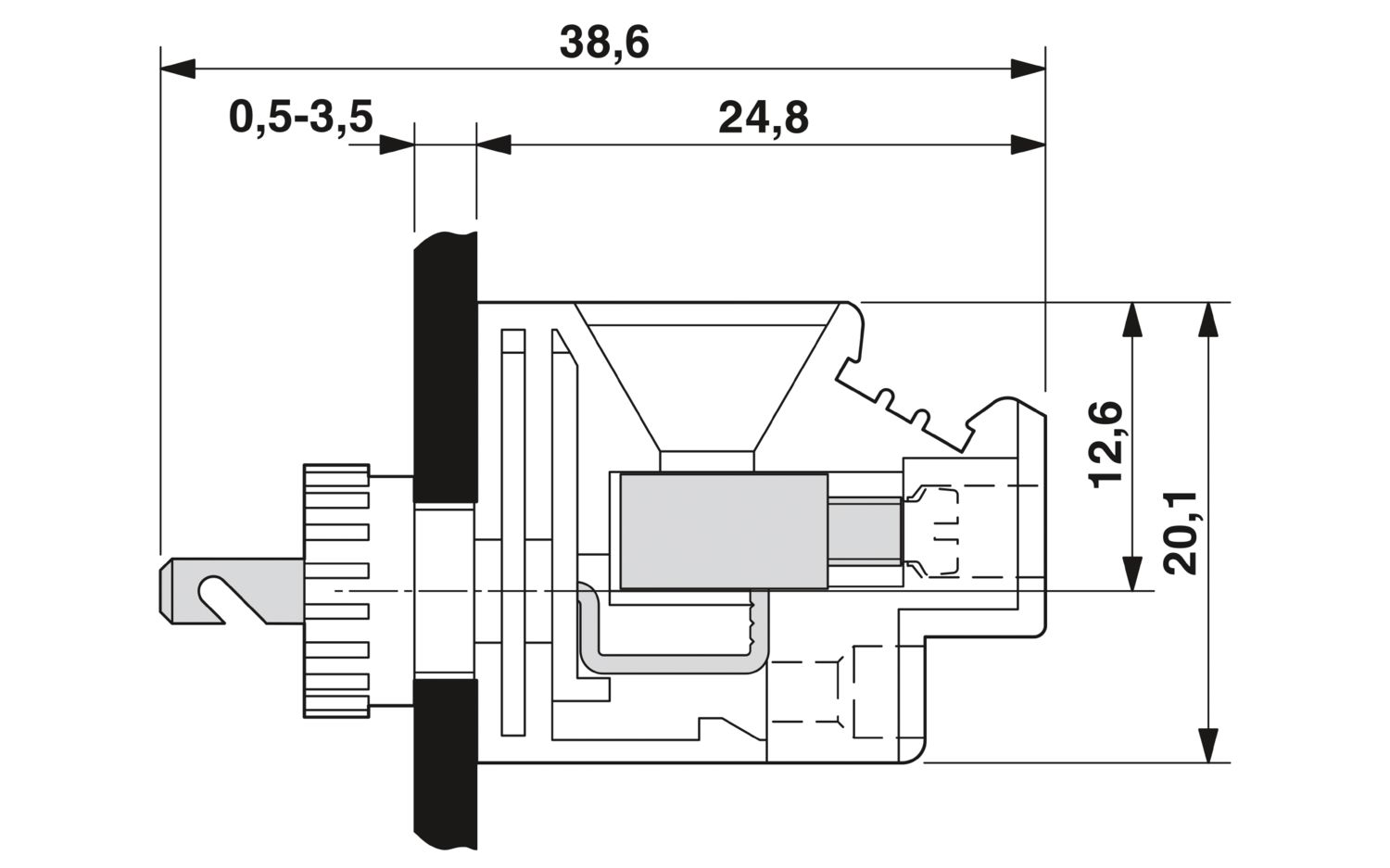 Проходные зажимы, тип подключения: Винтовой зажим с натяжной гильзой, Контакты под пайку / разъем для подключения плоского штекера, полюсов: 1, ток нагрузки: 18 A, cечение: 0,2 мм2 - 6 мм2, yгол между направлениями подключения провода и установки разъема: 90 °, ширина: 38 мм, цвет: серый