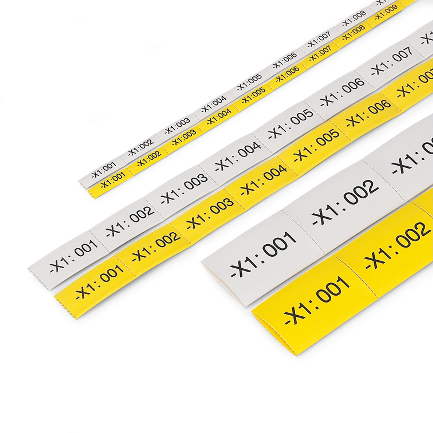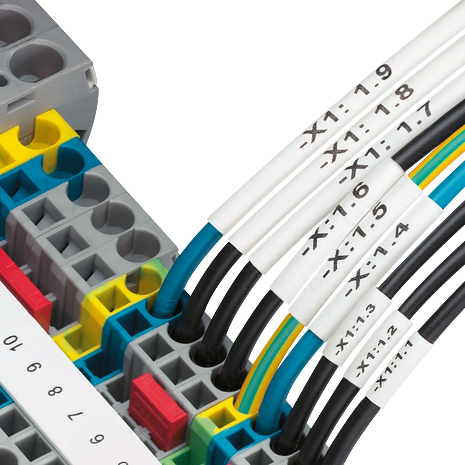 Длительная и постоянная маркировка одножильных кабелей, проводников, кабелей, пневматических шлангов и других цилиндрических поверхностей|Высокая гибкость, так в комбинации с отрезным и перфорационным ножом можно реализовать индивидуальные длины маркера в диапазоне 3,45 мм ... 2000 мм (0,14" ... 78,7")|Чтобы зафиксировать положение, дополнительно имеется возможность усадки при помощи любого метода тепловой обработки|Большой диапазон охвата диаметров за счет коэффициента усадки 3:1|Широкое распространение в производстве шкафов управления, машиностроении, нефтяной и газовой отрасли, а также железнодорожной промышленности по всему миру