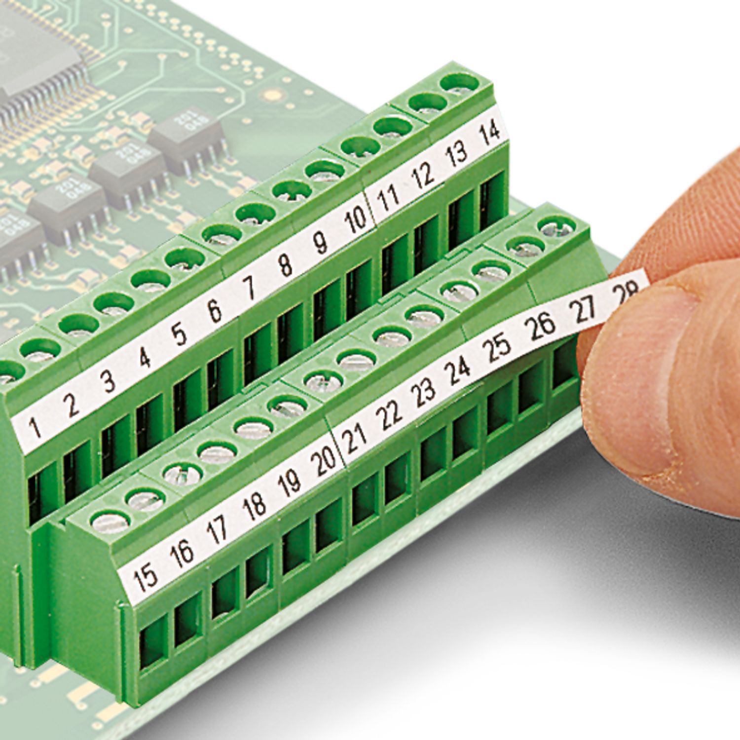 Самоклеящиеся маркировочные полосы семейства SK предназначены для маркировки продукции без пазов под таблички, идеальны для маркировки штекерных разъемов COMBICON|Планка Zack и плоская планка Zack предусматривают возможность последующей маркировки при помощи пленки TML|Быстрая и недорогая маркировка с помощью рулонных принтеров THERMOMARK ... от Phoenix Contact|В комбинации с подходящей красящей лентой нанесенные надписи отличаются высокой стойкостью к растворителям и механическим воздействиям|Нанесение надписей: Phoenix Contact наносит надписи на все маркеры TML ... индивидуально по вашему выбору