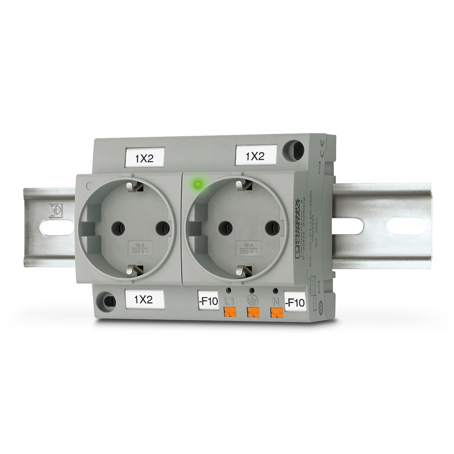 Двойная розетка, cо световым индикатором, Схема расположения контактов тип CF, тип подключения: Пружинный зажим Push-in, цвет: cерый, номинальное напряжение: 250 В AC (50 Гц), номинальный ток: 16 A, На монтажной рейке и прямой монтаж, cтандарты/нормативные документы: VDE 0620-1, МЭК 60884-1, Обозначения стран: Германия