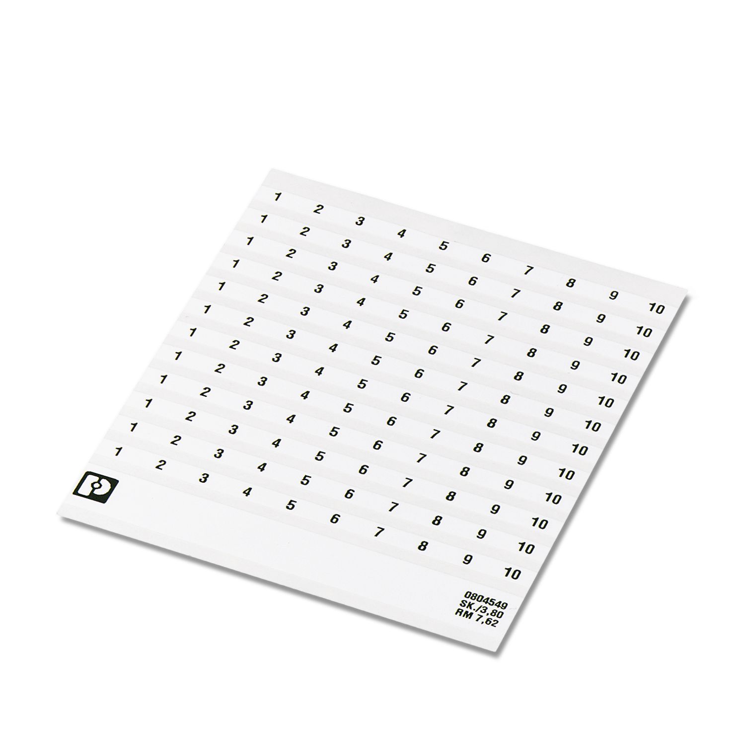 Листы с самоклеющейся маркировкой, с нанесенными вдоль полосы цифрами по порядку: 91 ... 100, Маркировочные полосы по 10 элементов каждая, по 12 одинаковых цифр десятками, белый, для клемм шириной: 7,62 мм, тип монтажа: склеивание