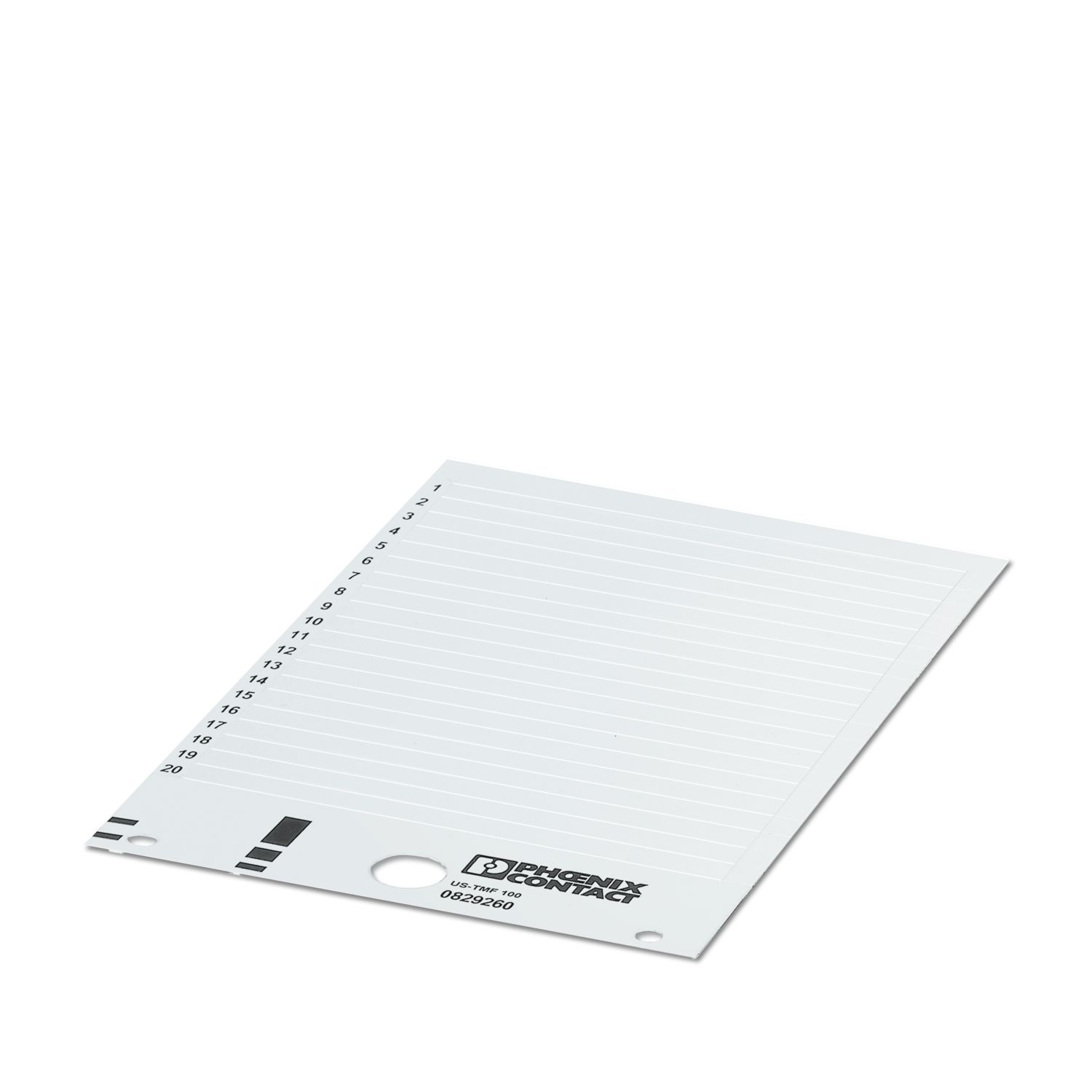 На картах имеется место для описания функций|Нанесение надписей: PhoenixContact наносит надписи на маркеры UniSheet по вашему выбору|Предварительно отштампованные маркировочные полосы легко отделяются и монтируются|Маркеры UniSheet US-TMF100 подходят для продуктов с плоским пазом для таблички