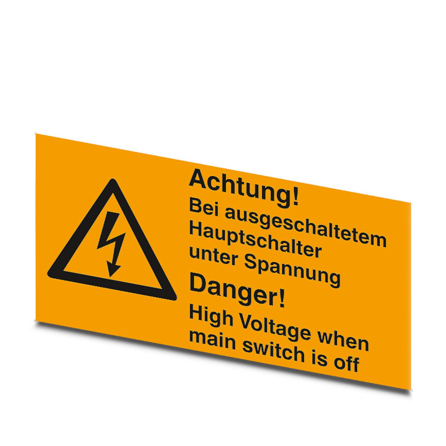 Предупредительная табличка, Лист, желтый/черный, с маркировкой: Изображение молнии и предупреждение на английском и немецком языке, тип монтажа: склеивание, Количество отдельных табличек: 4, высота текстового поля: 52 мм, ширина текстового поля: 105 мм