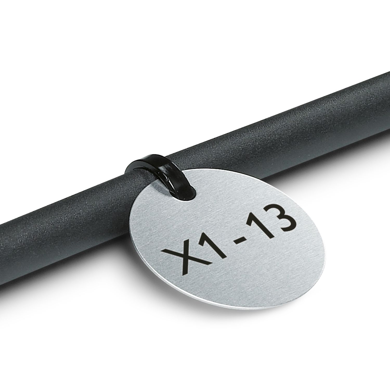 Алюминиевый элемент маркировки кабеля, монтаж при помощи кабельных стяжек|Презентабельный внешний вид|Обозначения из металла, с высокой прочностью при небольшом весе|Увеличенный срок службы благодаря декоративной анодированной поверхности|Подходит для нанесения крупноразмерной маркировки на проводники и кабели диаметром > 2,9 мм