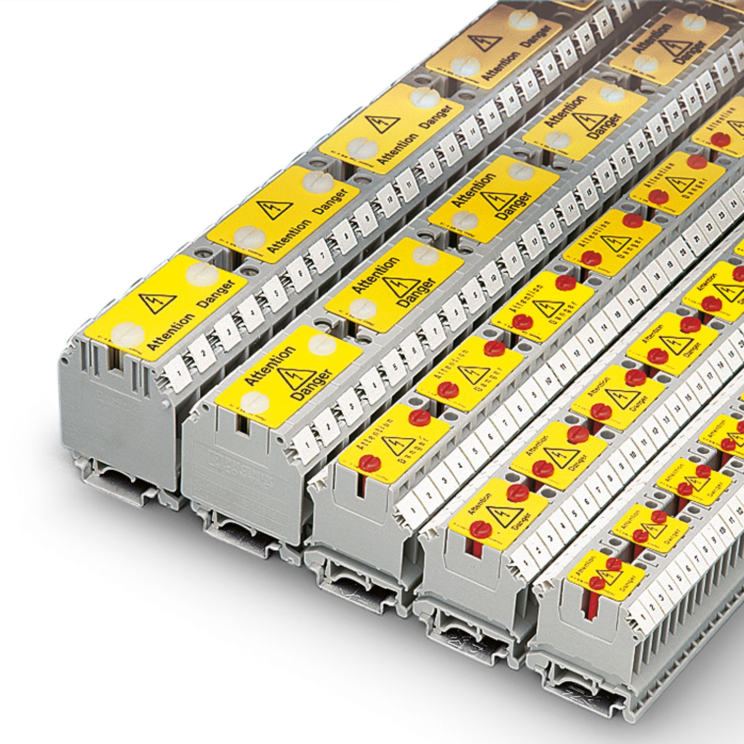 Предупреждающие таблички фиксируются в рядах шунтирования электротехнических клемм UK... с помощью пластиковых винтов|Надежная защита и маркировка клемм для подключения сети обеспечивается предупреждающими табличками|Таким образом предотвращается случайное срабатывание клеммных контактов