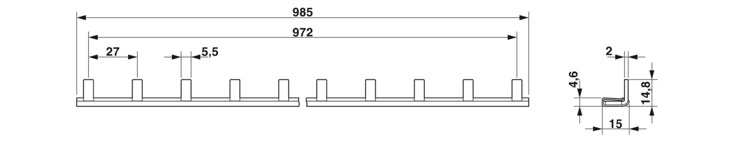 Сборная шина для силовых выключателей TMC 71... (однофазных) с модулем вспомогательного выключателя. Размер шага 27,0 мм, до 37 позиций. Рассчитано на 80 А (концевое питание), 600 В AC/1000 В DC. В списке UL 508 для подключения силовых выключателей с допуском UL 1077.