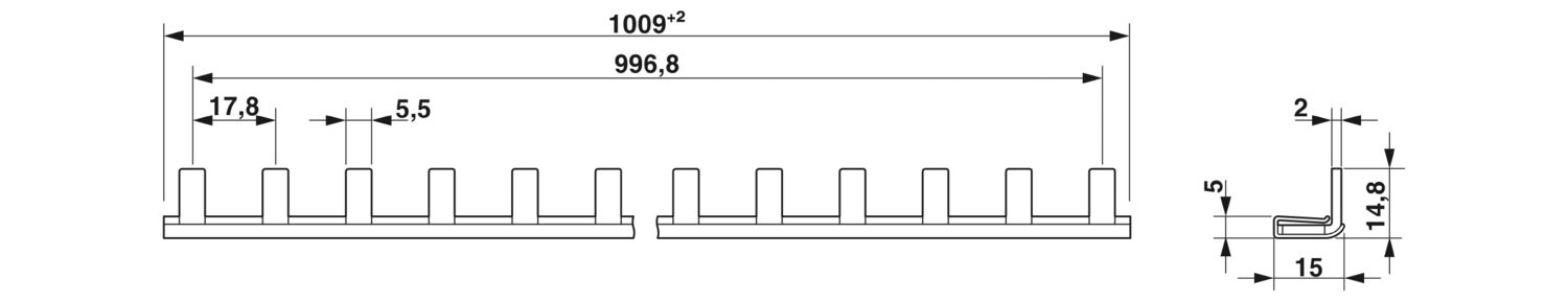 Сборная шина для силовых выключателей TMC 71... (однофазных) с размером шага 17,8 мм, до 57 позиций. Рассчитано на 80 А (концевое питание) 600 В AC/1000 В DC. В списке UL508 для подключения силовых выключателей с допуском UL1077.