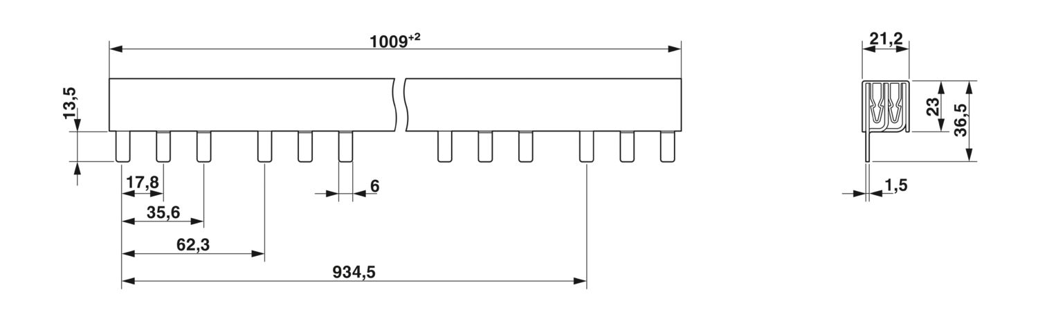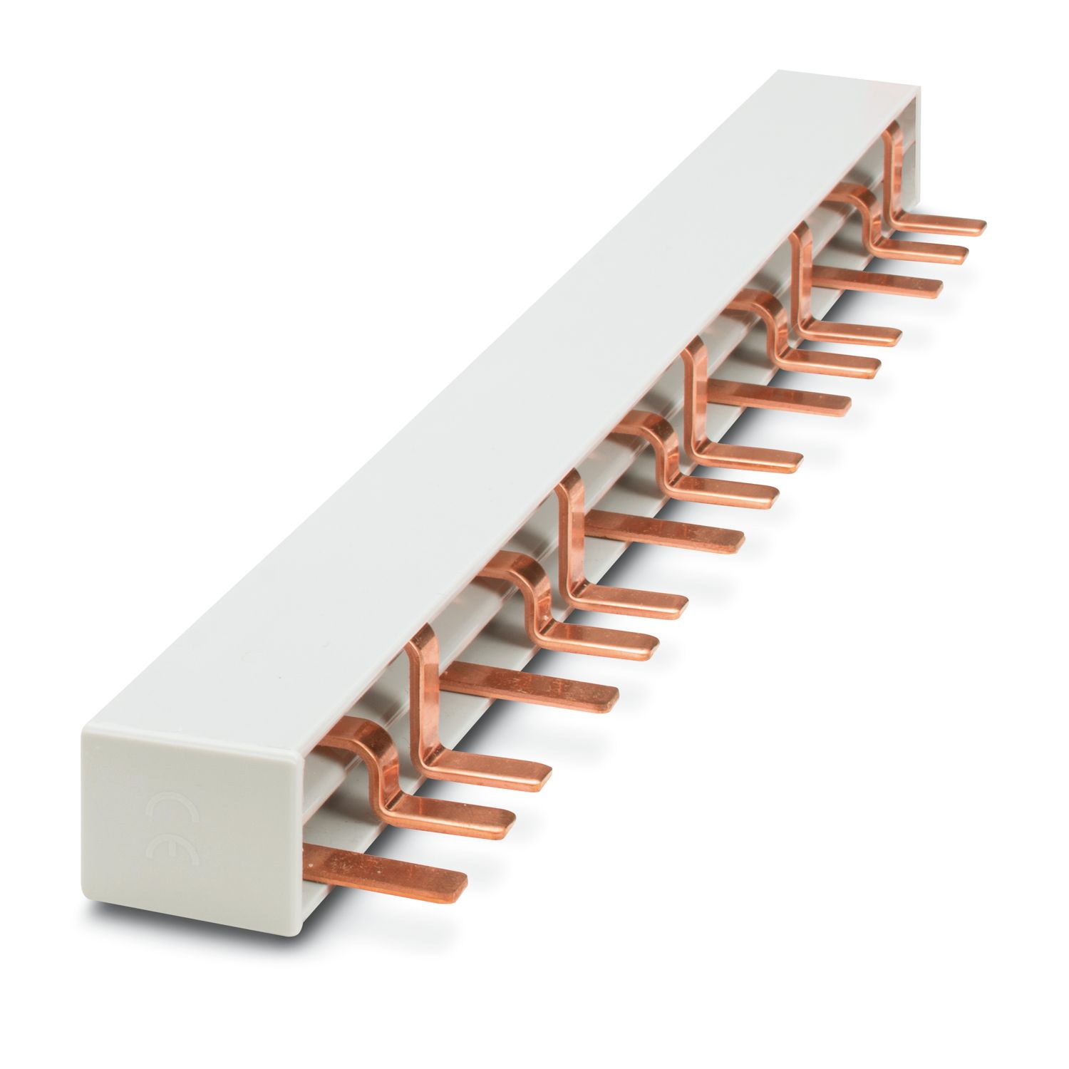 Сборная шина для силовых выключателей TMC 73... (двухфазных) с вспомогательным выключателем. Размер шага 17,8 мм, до 48 позиций. Рассчитано на 80 А (концевое питание) 600 В AC/DC. В списке UL 508 для подключения силовых выключателей с допуском UL 1077.