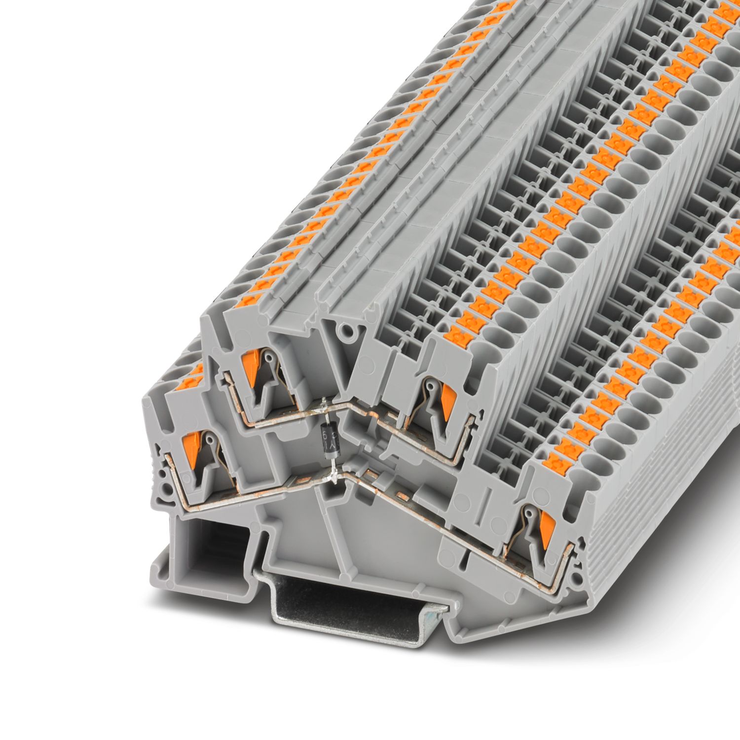 Клеммный блок, с интегрированным диодом 1N4007, после установки символ включения находится в поле зрения, номинальный ток: 0,5 A, количество точек подсоединения: 4, тип подключения: Зажимы Push-in, Расчетное сечение: 2,5 мм2, 1. и 2-ий ярус, cечение: 0,14 мм2 - 4 мм2, тип монтажа: NS 35/7,5, NS 35/15, цвет: cерый