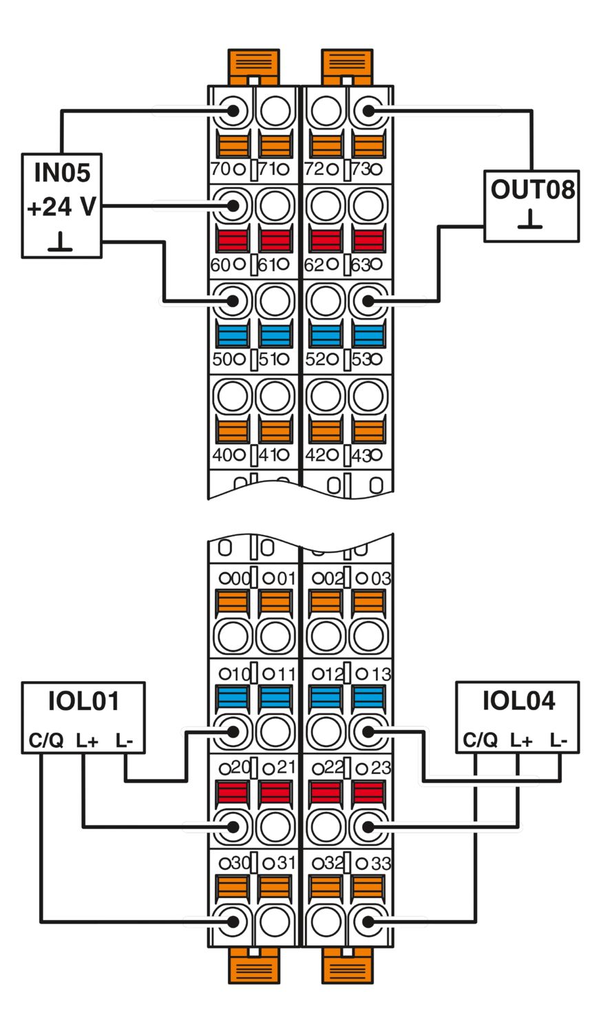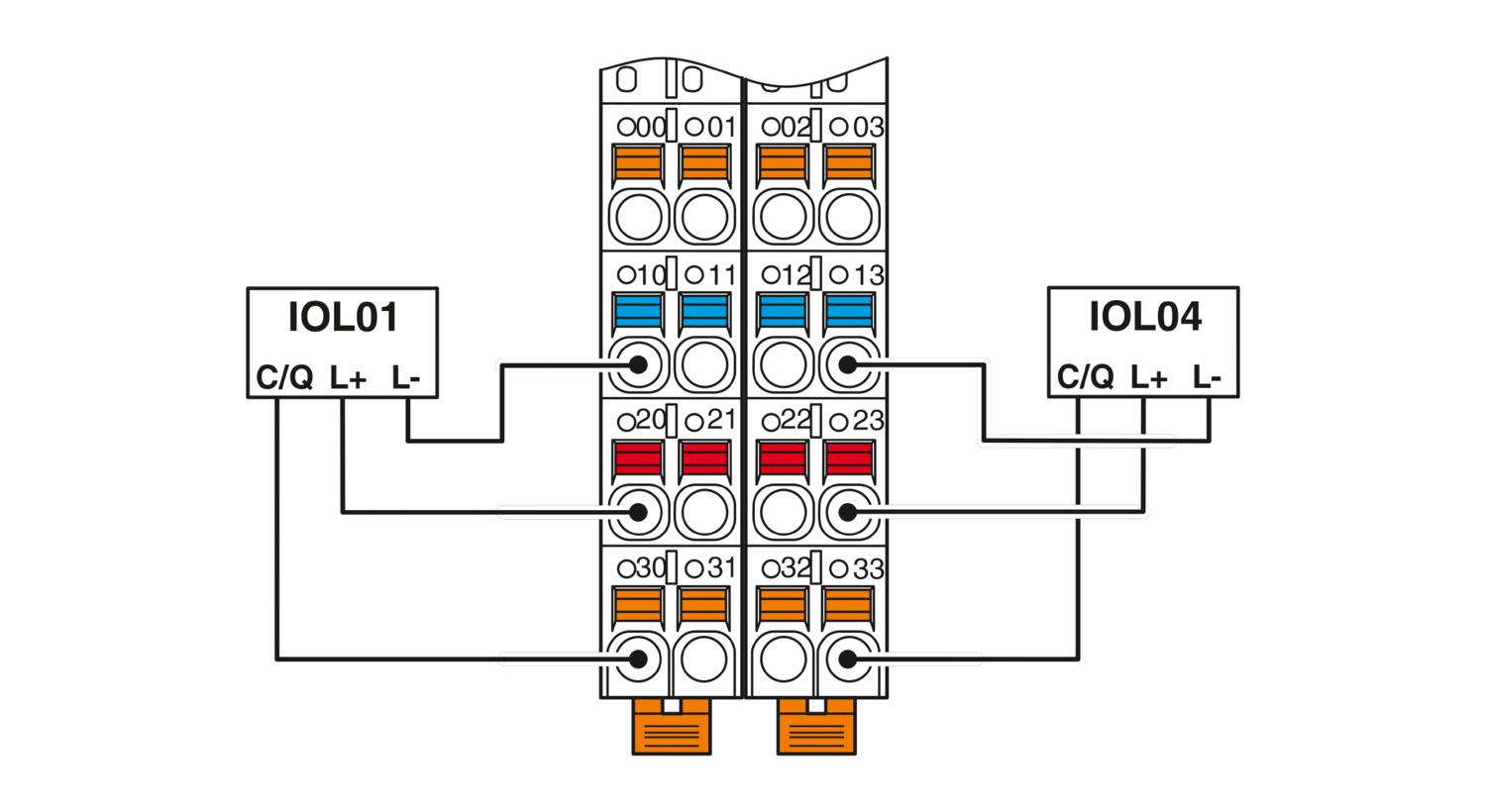 Подключение восьми устройств IO-Link|В качестве альтернативы: подключение одного цифрового датчика или исполнительного элемента к каждому порту|Подключение устройств IO-Link по 3-проводной схеме|3-проводная схема подключения датчиков|2- и 3-проводная схема подключения исполнительных устройств|Хранение данных параметров на главном устройстве|Спецификация IO-Link V1.1.2|Для каждого порта можно настроить замещающие значения входов и выходов|Поддержка IOL-CONF (начиная с версии встроенной программы 1.02)|Сохранение в памяти таблички спецификации устройства