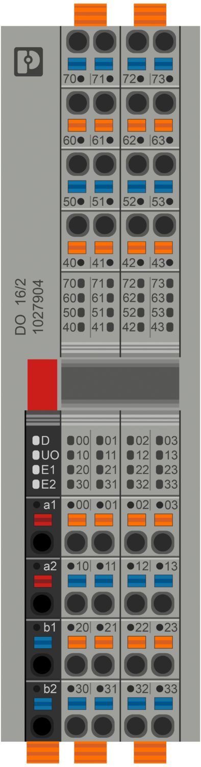 16 цифровых выхода|24 B DC, 500 мA|2-проводная схема подключения исполнительных элементов|Диагностика отдельных каналов|Минимальное время обновления менее 100 мкс|Сохранение в памяти таблички спецификации устройства