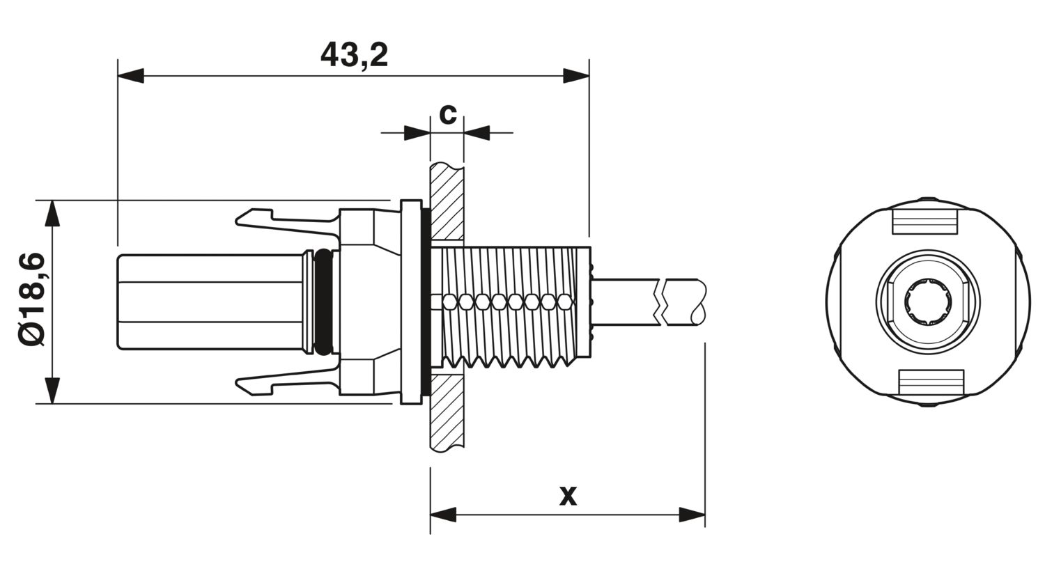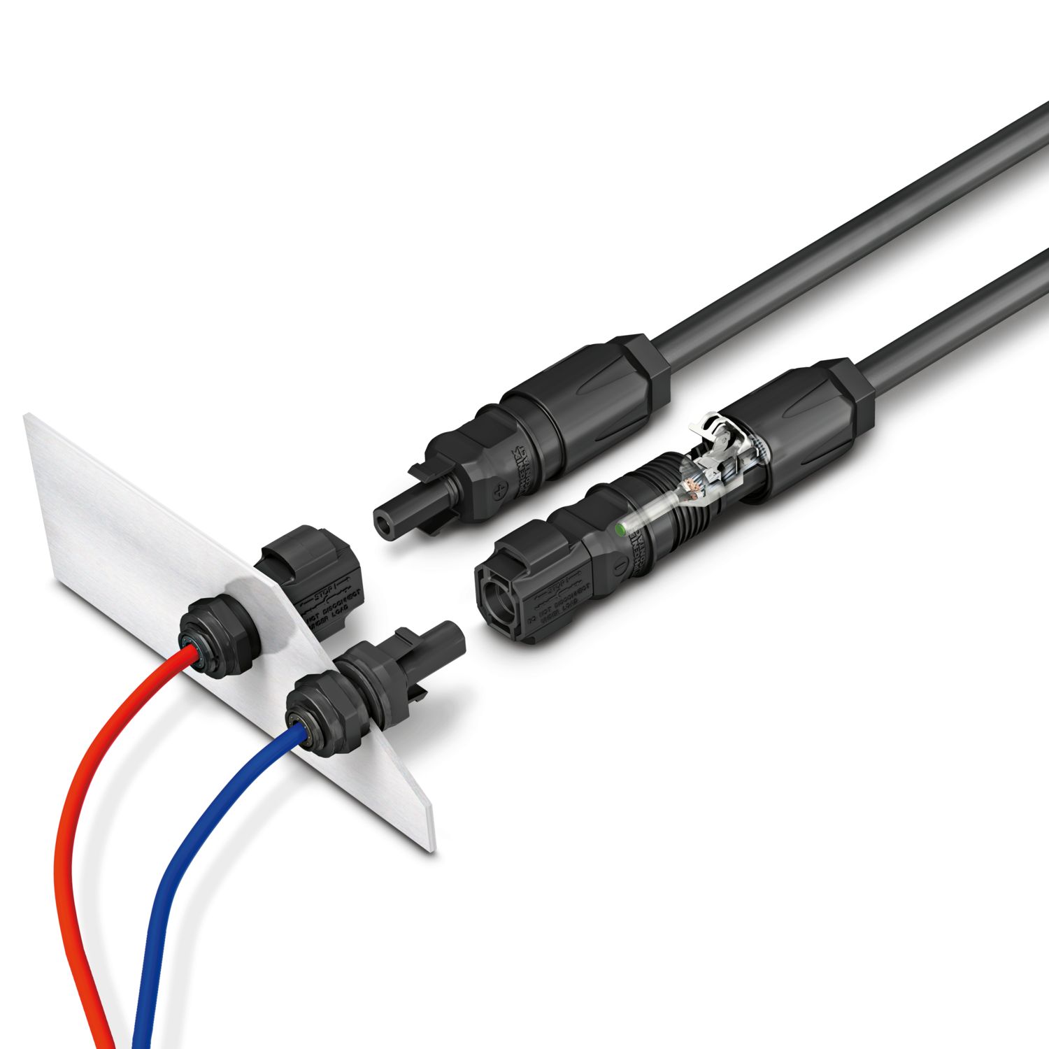 Аппаратн. соединитель передняя стенка, Серия изделий: SUNCLIX, цвет: черный, полюсов: 1, сечение жилы мин.: 2,5 мм2, расчетное напряжение: 1000 V DC, расчетный ток: 27 A, Тип подключения: Обжим, длина кабеля: 115