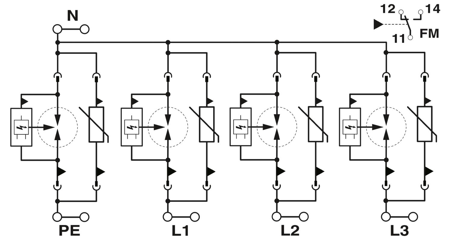 Вставной комбинированный разрядник для защиты от грозовых и импульсных перенапряжений, по типу 1+2 / класс I+II, для изолированных 3-фазных цепей электропитания, с отдельным N и PE (L1, L2, L3, N, PE).