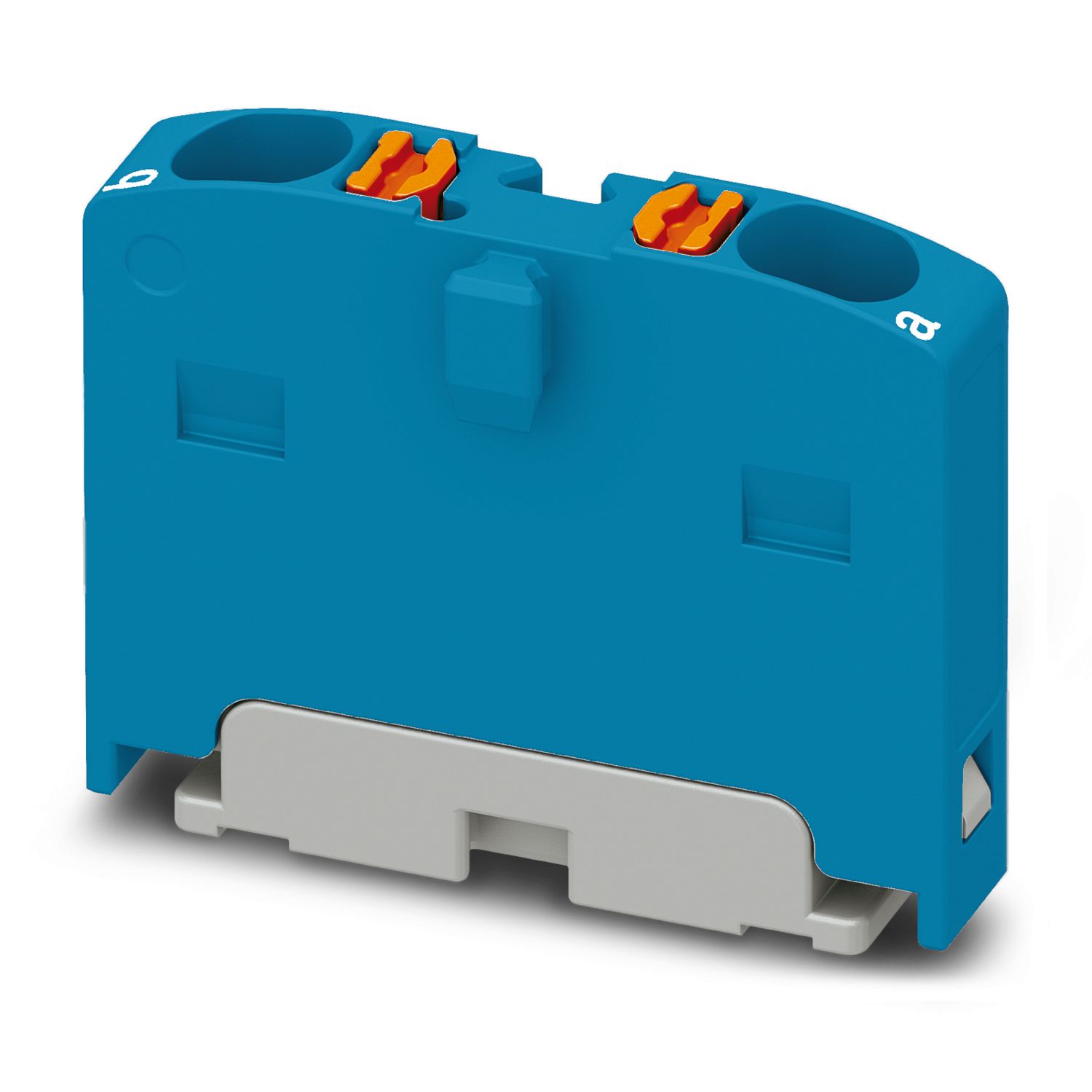 Моноблок, Базовая клемма, номинальное напряжение: 450 В, номинальный ток: 17,5 A, количество точек подсоединения: 2, тип подключения: Зажимы Push-in, cечение: 0,14 мм2 - 2,5 мм2, тип монтажа: крепление защелками на адаптере для монтажной рейки, Прямой монтаж при помощи фланца, Подвесной, цвет: синий