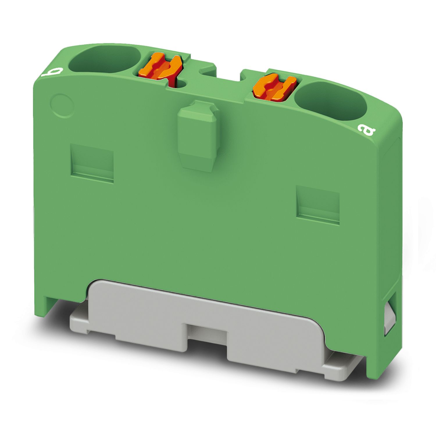 Моноблок, Базовая клемма, номинальное напряжение: 450 В, номинальный ток: 17,5 A, количество точек подсоединения: 2, тип подключения: Зажимы Push-in, cечение: 0,14 мм2 - 2,5 мм2, тип монтажа: крепление защелками на адаптере для монтажной рейки, Прямой монтаж при помощи фланца, Подвесной, цвет: зеленый