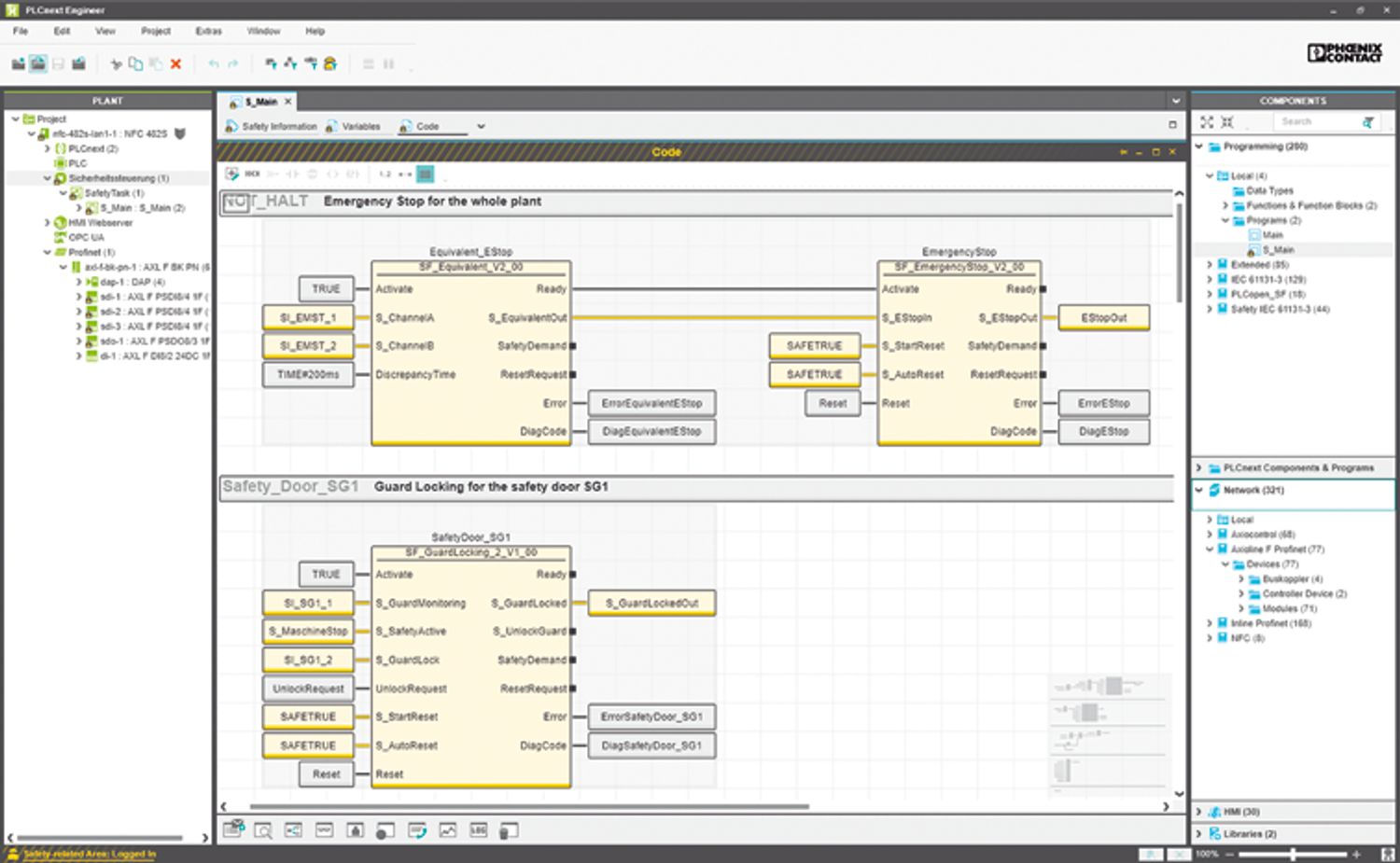 Редактор (сертификат TÜV Rheinland) для программирования пользовательских приложений, связанных с обеспечением безопасности, и для конфигурации и ввода в эксплуатацию устройств PROFIsafe в ориентированных на безопасность системах управления с технологией PLCnext Technology.