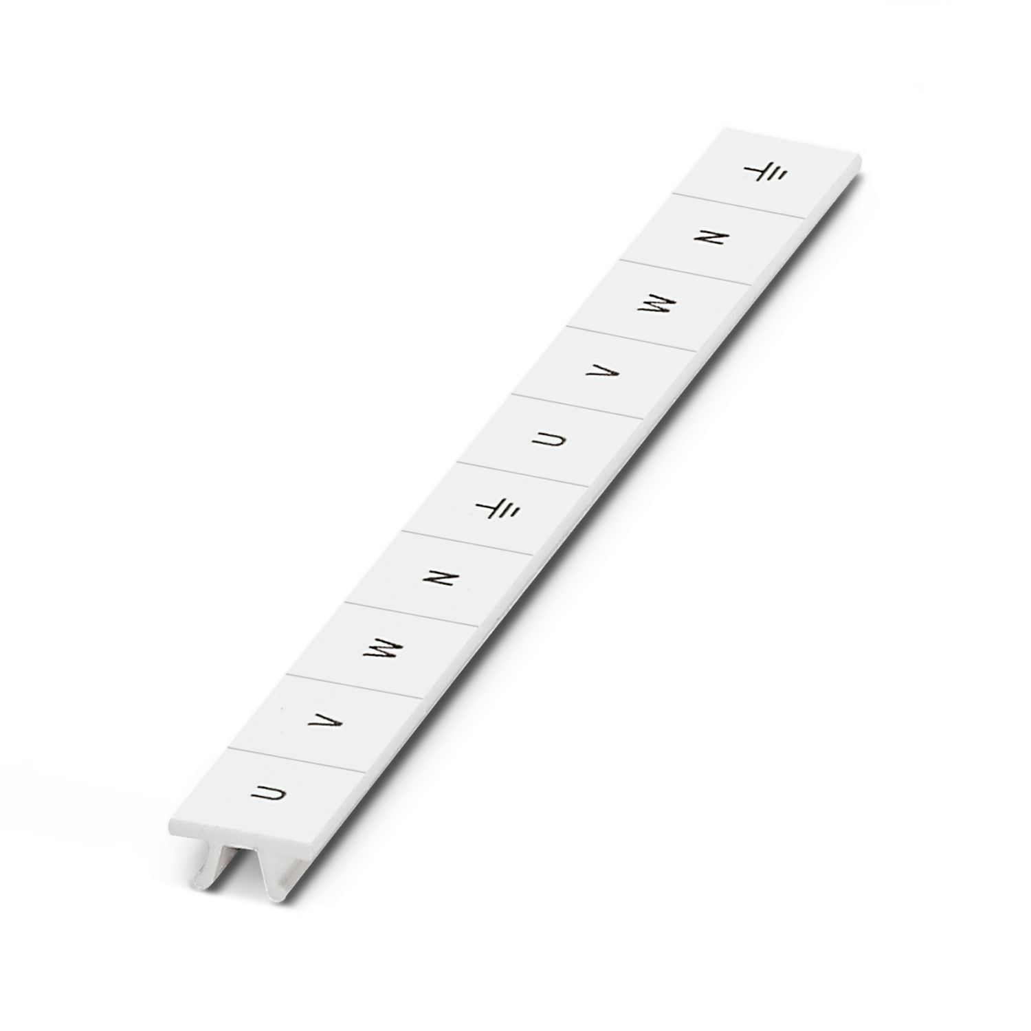 Маркировка для клеммных модулей, Полоса, белый, с маркировкой, маркируется с помощью: CMS-P1-PLOTTER, горизонтально: U, V, W, N, GND, U, V, W, N, GND, тип монтажа: фиксация, для клемм шириной: 10,2 мм, Количество отдельных табличек: 10, высота текстового поля: 10,5 мм, ширина текстового поля: 10,15 мм