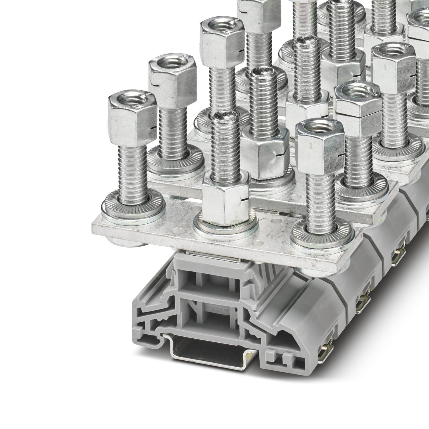 Сильноточные клеммы, номинальное напряжение: 1000 В, номинальный ток: 269 A, количество точек подсоединения: 2, тип подключения: Болтовые клеммы, Расчетное сечение: 120 мм2, тип монтажа: NS 35/7,5, NS 35/15, цвет: cерый