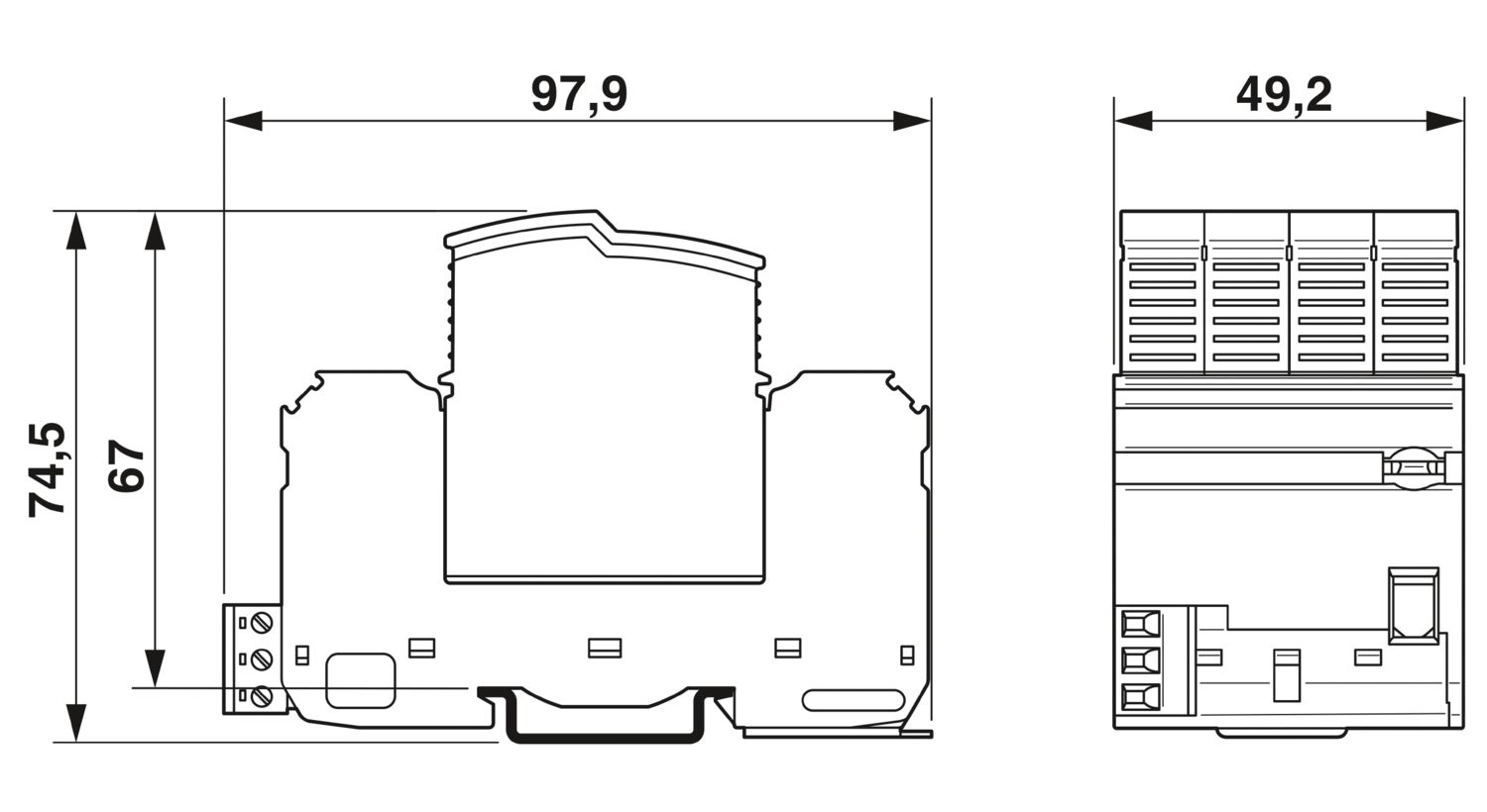 Модуль для установки на монтажную рейку, состоящий из двух частей, закрепляется на защелках