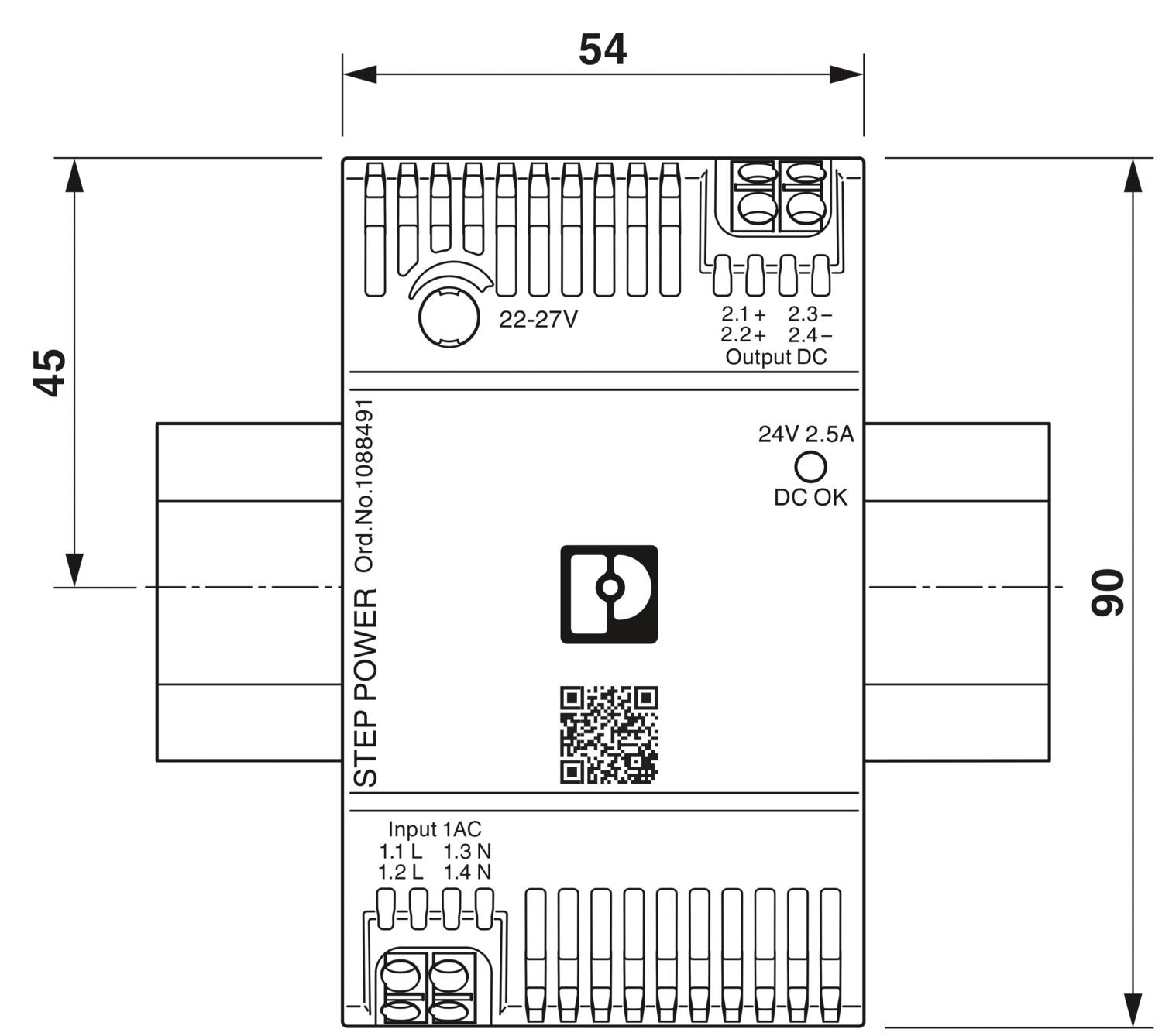 Импульсный источник питания, STEP POWER, Зажимы Push-in, На монтажной рейке и прямой монтаж, вход: 1-фазный, выход: 24 В DC / 2,5 A, настройка в диапазоне 22 В DC ... 27 В DC