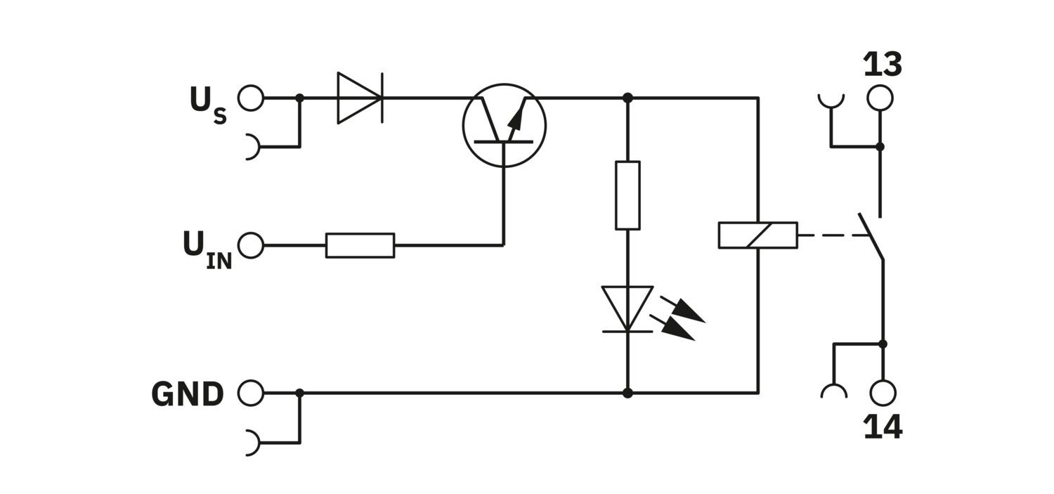 PLC-INTERFACE, состоит из базовой клеммы с зажимом push-in и штекерным миниатюрным реле с внутренней схемой усиления и соответствующим вспомогательным напряжением для слабых источников сигнала, 1 замыкающий контакт, входное номинальное напряжение 5 В DC