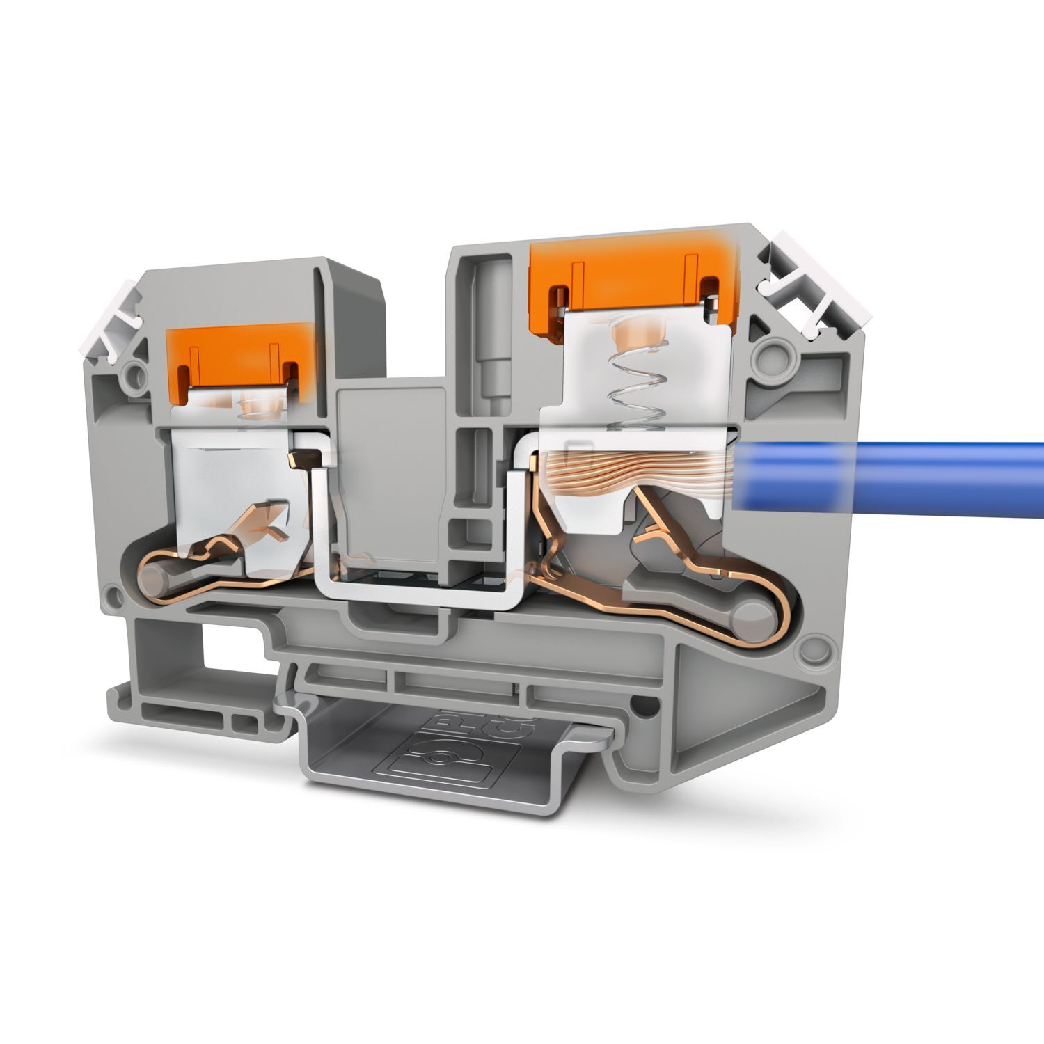 Быстрое, не требующее усилий соединение для любых видов проводов благодаря предварительно натянутым контактным пружинам|Высокая гибкость в процессе ввода провода обеспечивает простое подключение проводов с наконечником или без него|Наглядное соединение провода за счет наличия бокового направления подключения и однозначной позиции кнопки управления пружинным контактом|Простое получение информации: QR-код на клемме содержит все необходимые сведения об изделии|Клеммные блоки с зажимами Push-X являются частью системы COMPLETE line