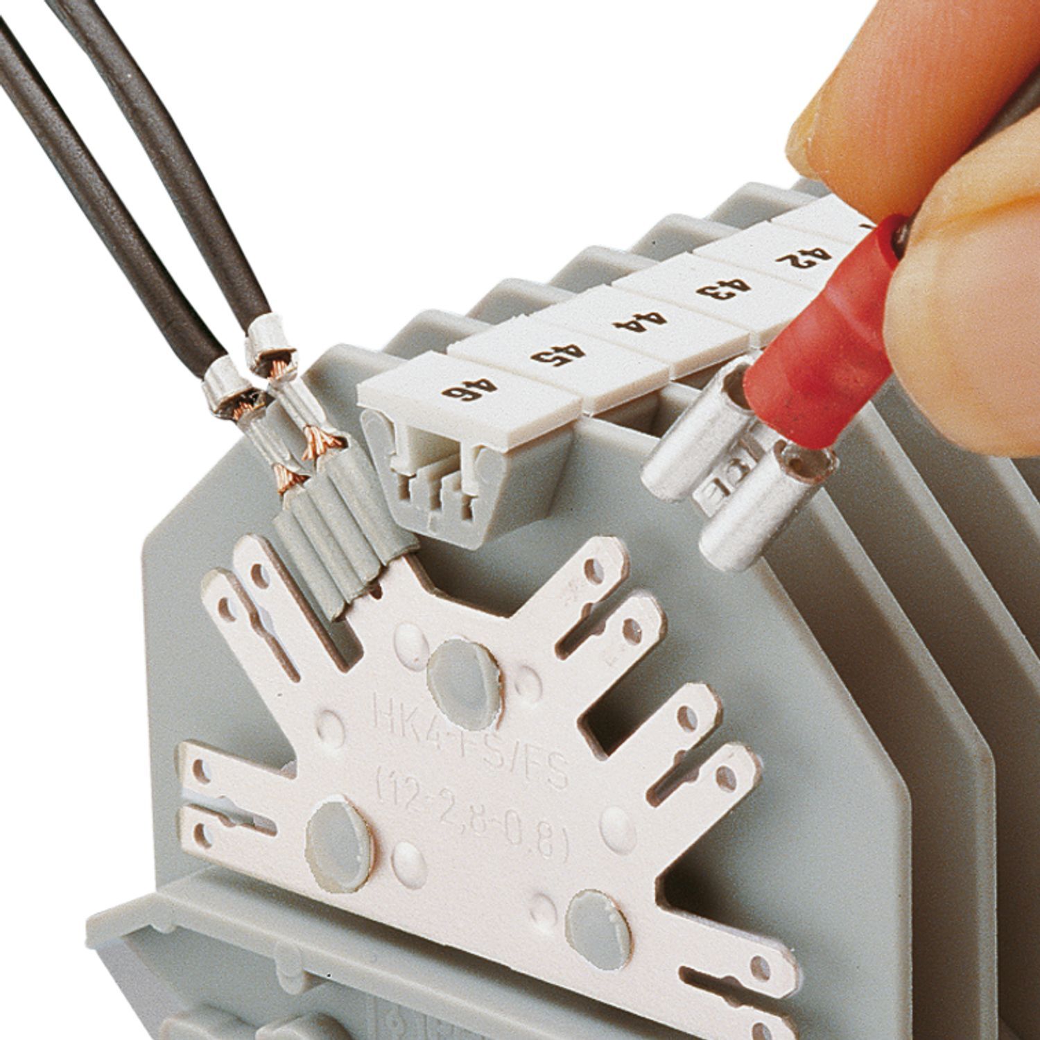 Шлицованные штекеры позволяют подсоединять вместо одного наконечника под плоский вывод 6,3 мм один полностью изолированный или два неизолированных наконечника 2,8 мм|Стенка корпуса только немного выступает над металлической частью, поскольку для подсоединения применяются полностью изолированные наконечники|Во многих случаях фронтальное расположение плоских выводов обеспечивает наиболее оптимальное подсоединение, особенно в условиях ограниченного монтажного пространства и при расположении рядом с клеммной группой кабельного канала