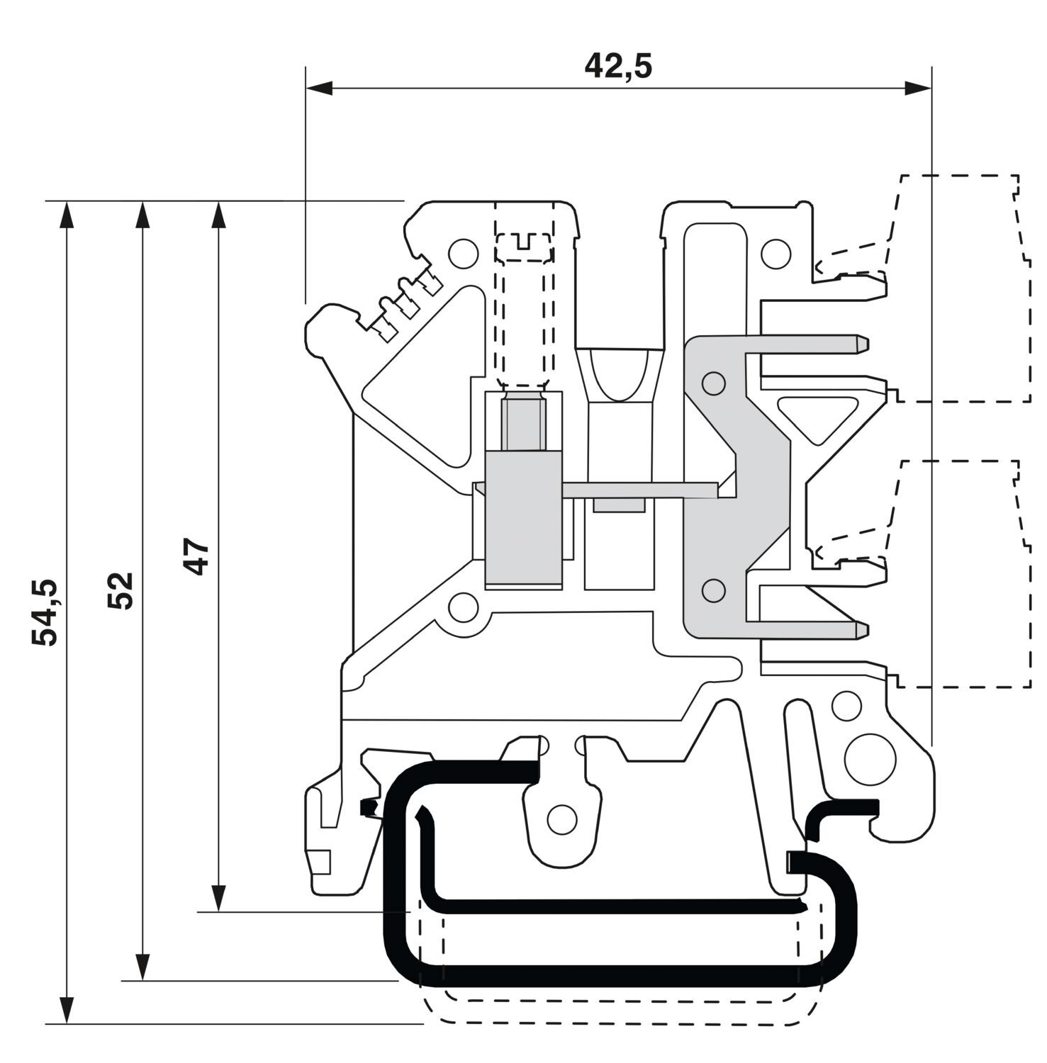 Проходные клеммы, номинальное напряжение: 250 В, номинальный ток: 12 A, количество точек подсоединения: 3, полюсов: 1, тип подключения: Винтовое / штекерное подключение, 2. ярус, подключение слева, cечение: 0,2 мм2 - 4 мм2, тип монтажа: NS 32, NS 35/15, NS 35/7,5, цвет: cерый