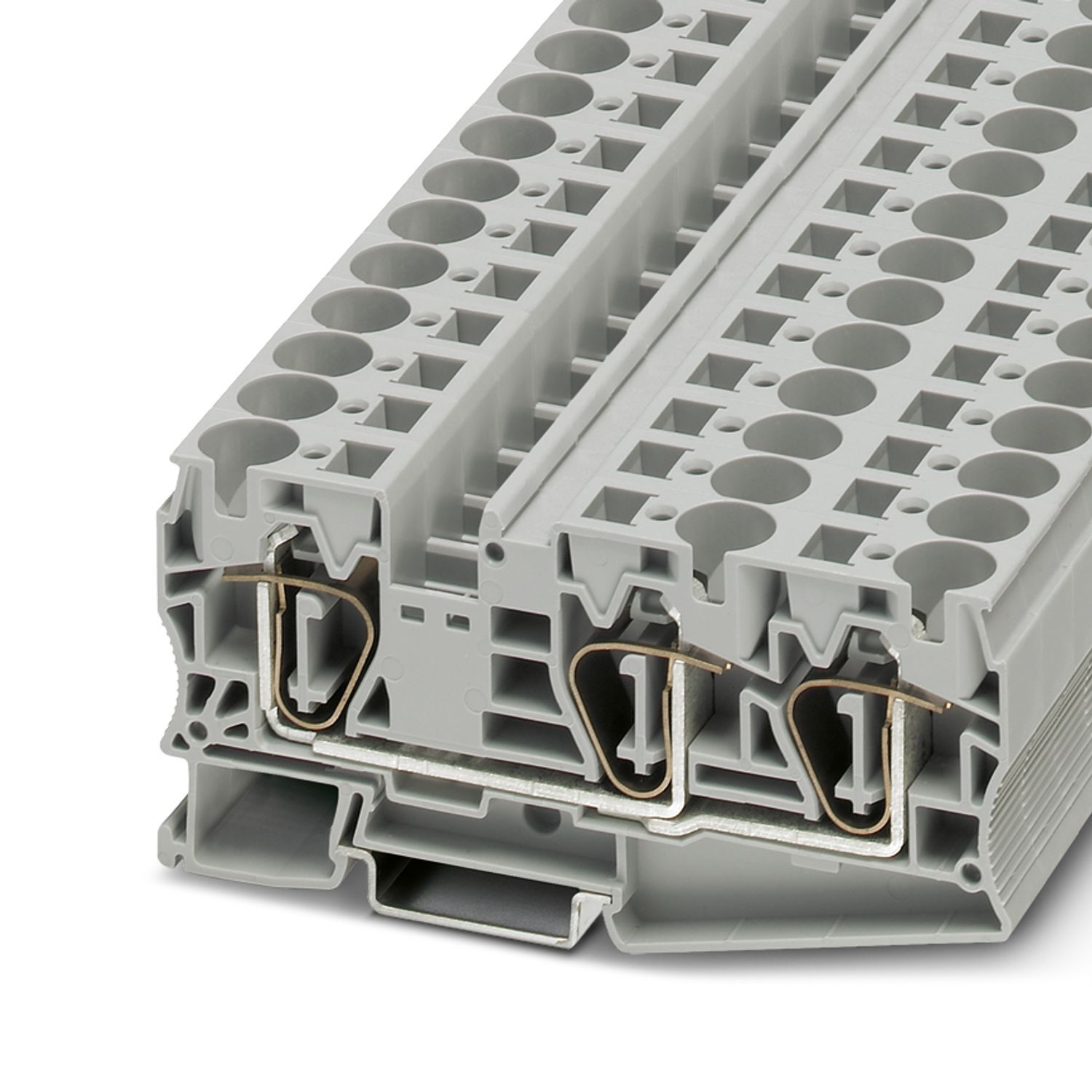 Трехпроводные пружинные клеммы ST ...-TWIN являются компактной альтернативой стандартным проходным клеммам в случаях, когда требуется выполнить разводку потенциалов с помощью проводов сечением 10 и 16 мм²|Описание гибких возможностей установки соединений в системе CLIPLINE complete приведено в разделе "Принадлежности для соединительных клеммных систем CLIPLINE complete"|Идеально подходят для разветвителей потенциалов в кольцевых сетях|Соединение с клеммами с номинальным поперечным сечением 2,5 или 4 мм² прозводится с помощью переходной перемычки RB ST ...(2,5/4) без дополнительных проводов