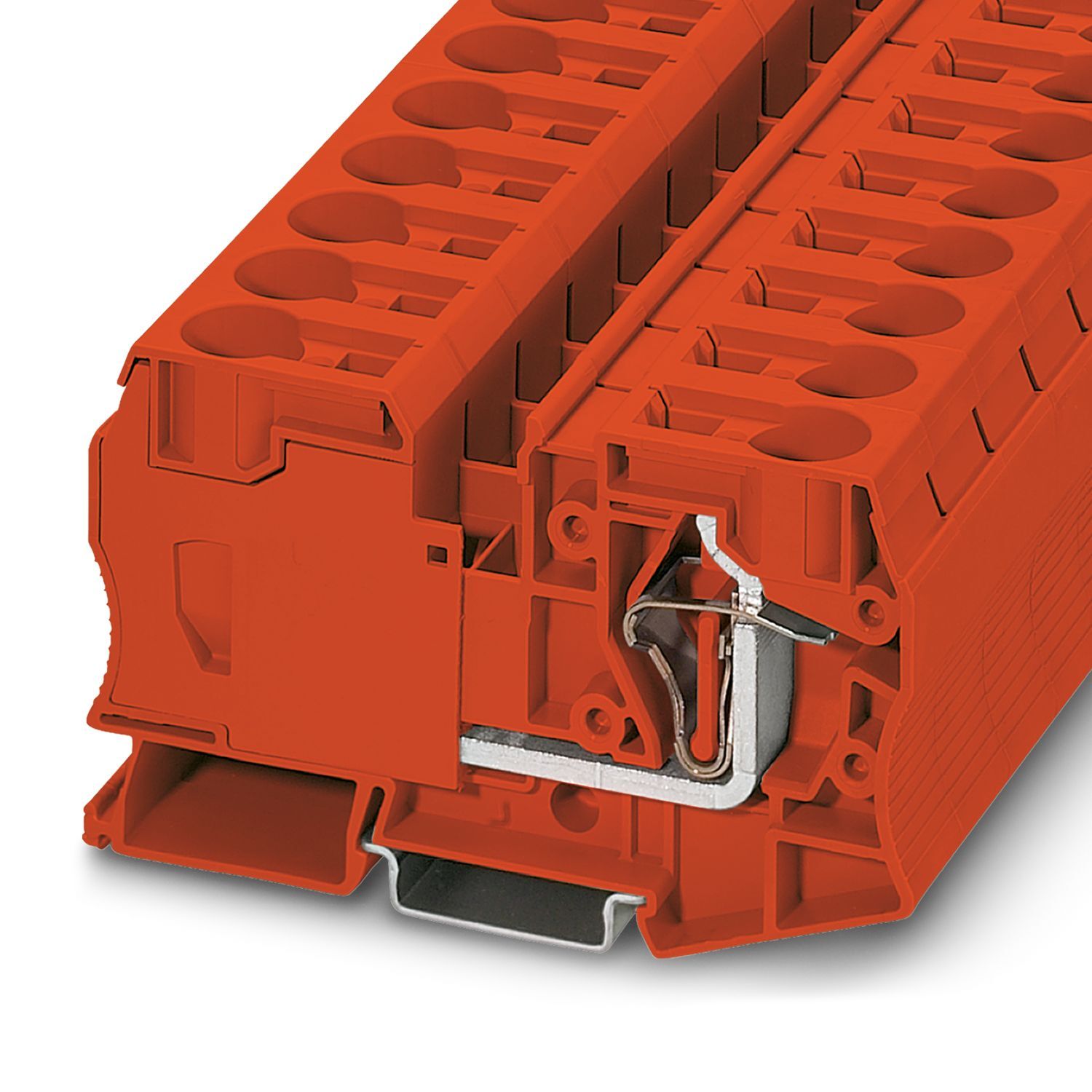 Проходные клеммы, номинальное напряжение: 1000 В, номинальный ток: 125 A, количество точек подсоединения: 2, тип подключения: Пружинный зажим, Расчетное сечение: 35 мм2, 1. ярус, cечение: 2,5 мм2 - 35 мм2, тип монтажа: NS 35/7,5, NS 35/15, цвет: красный