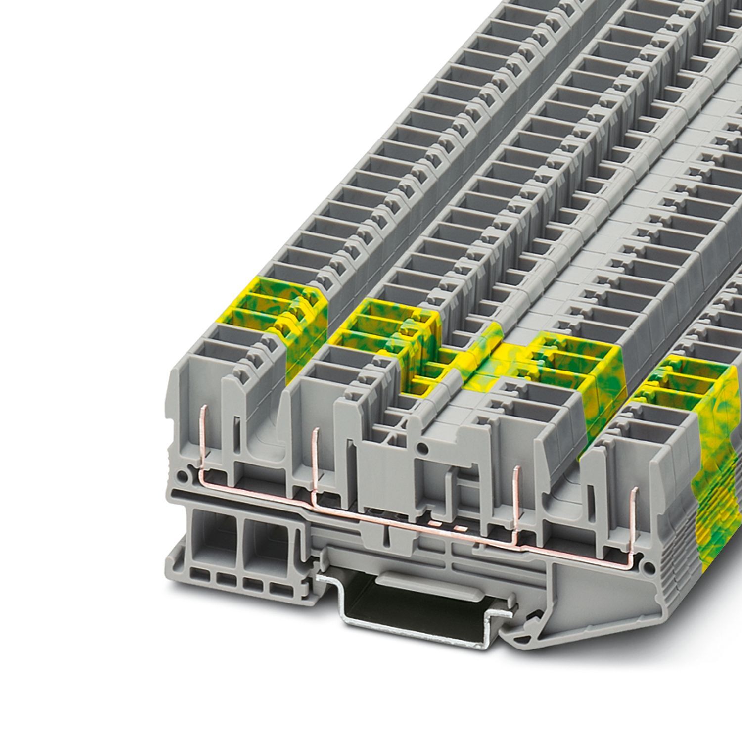 Форма и шаг аналогичны форме и шагу клемм исполнения PIN/PIN серии COMBI|Надежный механический и электрический контакт с монтажной рейкой обеспечивается простым защелкиванием|Клеммы ST...‑PE соответствуют всем требованиям стандарта МЭК 60947-7-2|Опробовано для железнодорожного транспорта