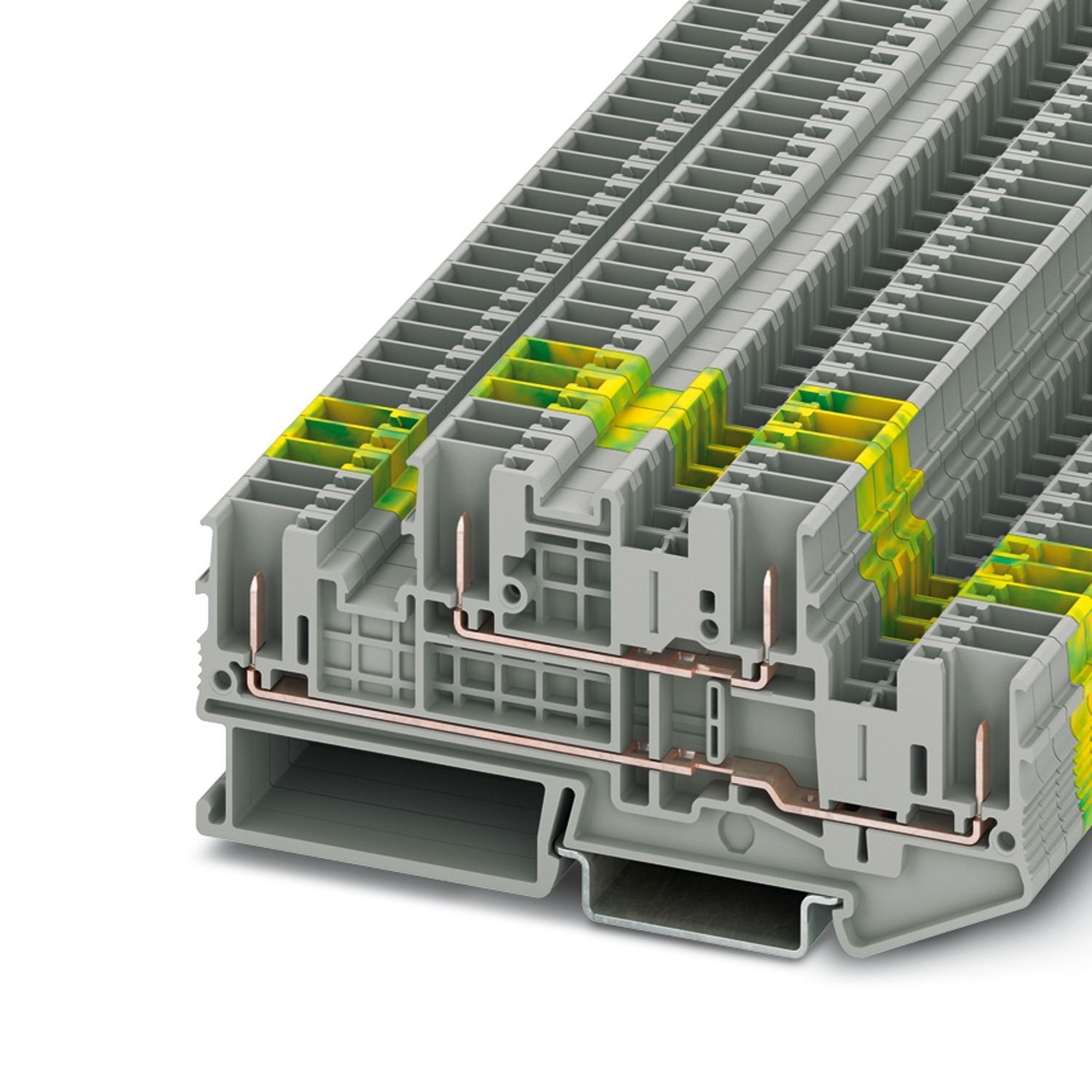 Форма и шаг аналогичны форме и шагу клемм исполнения PIN/PIN серии COMBI|Надежный механический и электрический контакт с монтажной рейкой обеспечивается простым защелкиванием|Клеммы ST...‑PE соответствуют всем требованиям стандарта МЭК 60947-7-2|Опробовано для железнодорожного транспорта