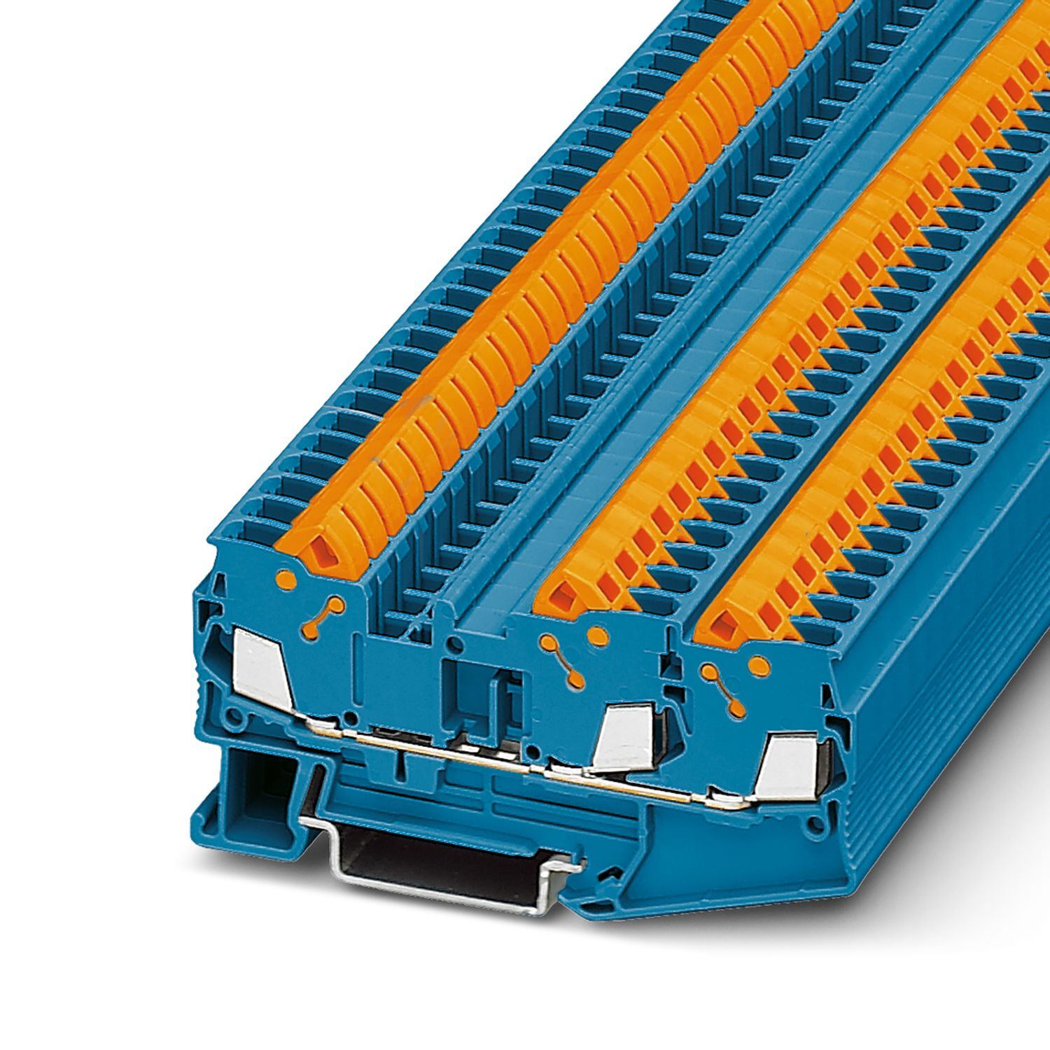 Проходные клеммы, номинальное напряжение: 800 В, номинальный ток: 24 A, количество точек подсоединения: 3, тип подключения: Быстрое подключение, Расчетное сечение: 2,5 мм2, 1. ярус, cечение: 0,5 мм2 - 2,5 мм2, тип монтажа: NS 35/7,5, NS 35/7,5, цвет: синий