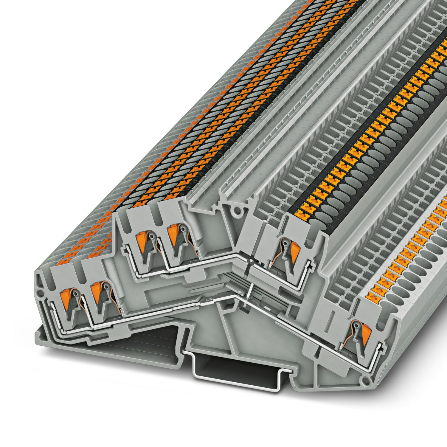 Двухъярусные клеммы, с потенциальным разъемом, номинальное напряжение: 800 В, номинальный ток: 20 A, тип подключения: Зажимы Push-in, 1. и 2-ий ярус, Расчетное сечение: 2,5 мм2, cечение: 0,14 мм2 - 4 мм2, тип монтажа: NS 35/7,5, NS 35/15, цвет: cерый