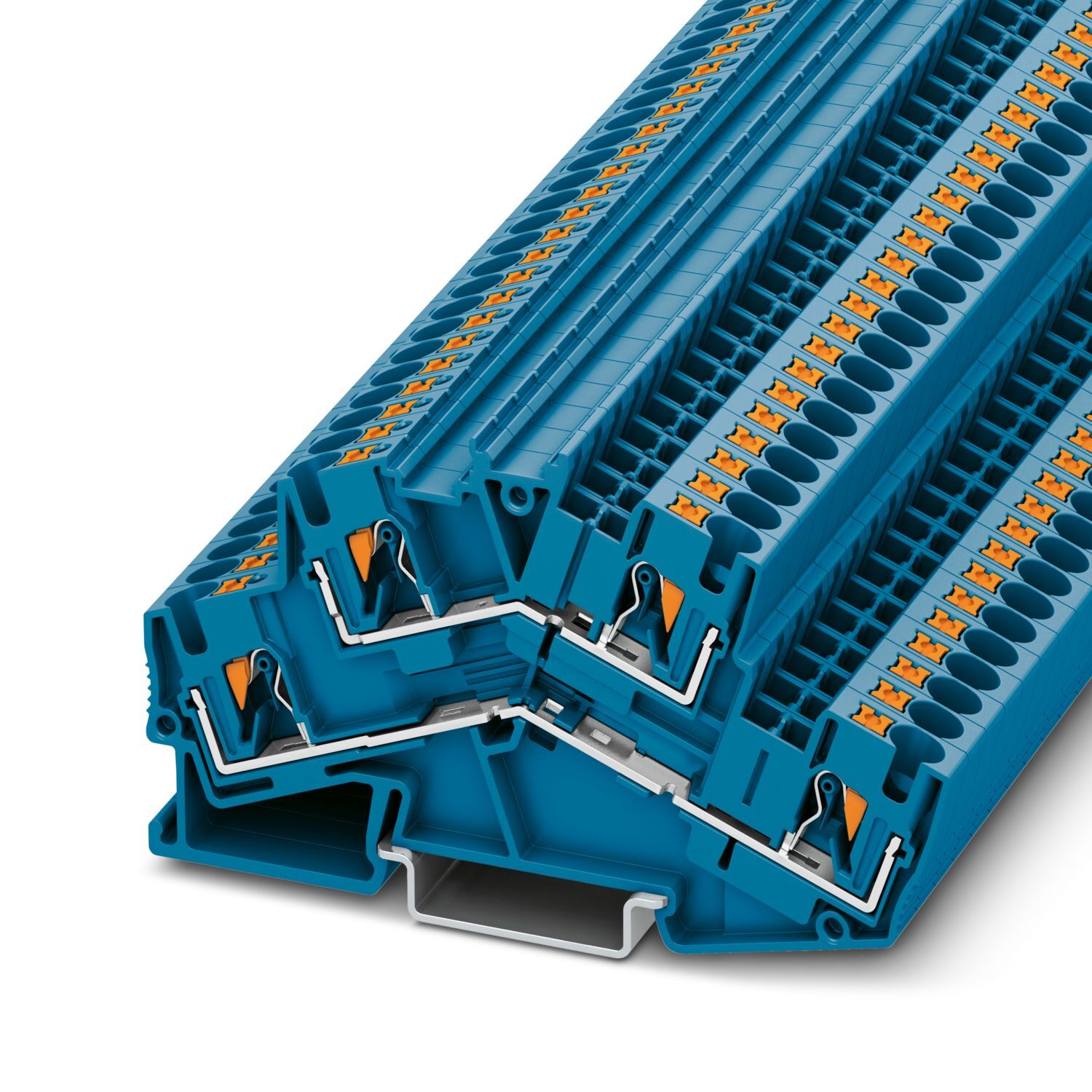 Двухъярусные клеммы, номинальное напряжение: 800 В, номинальный ток: 28 A, тип подключения: Зажимы Push-in, 1. и 2-ий ярус, Расчетное сечение: 4 мм2, cечение: 0,2 мм2 - 6 мм2, тип монтажа: NS 35/7,5, NS 35/15, цвет: синий